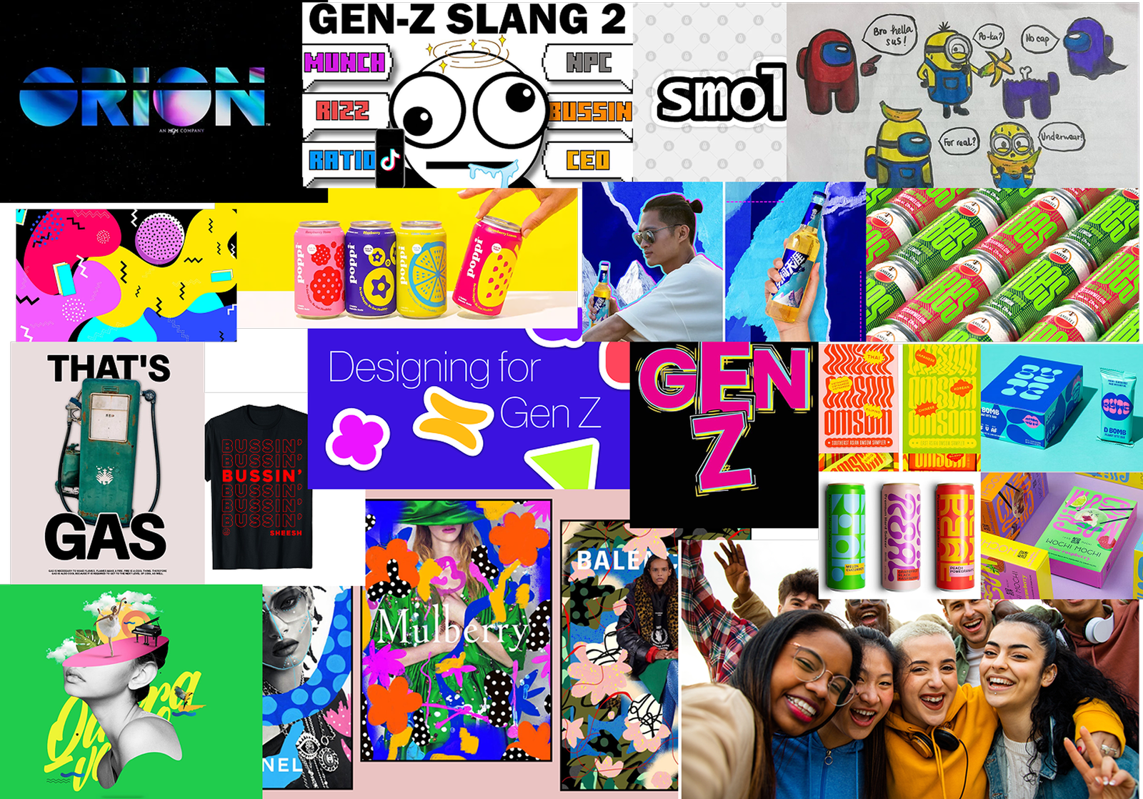 To get an idea of what kind of designs we want to make and what kind of vibes we want to give to the clients, I created a mood board in which I included GenZ design trends and memes.